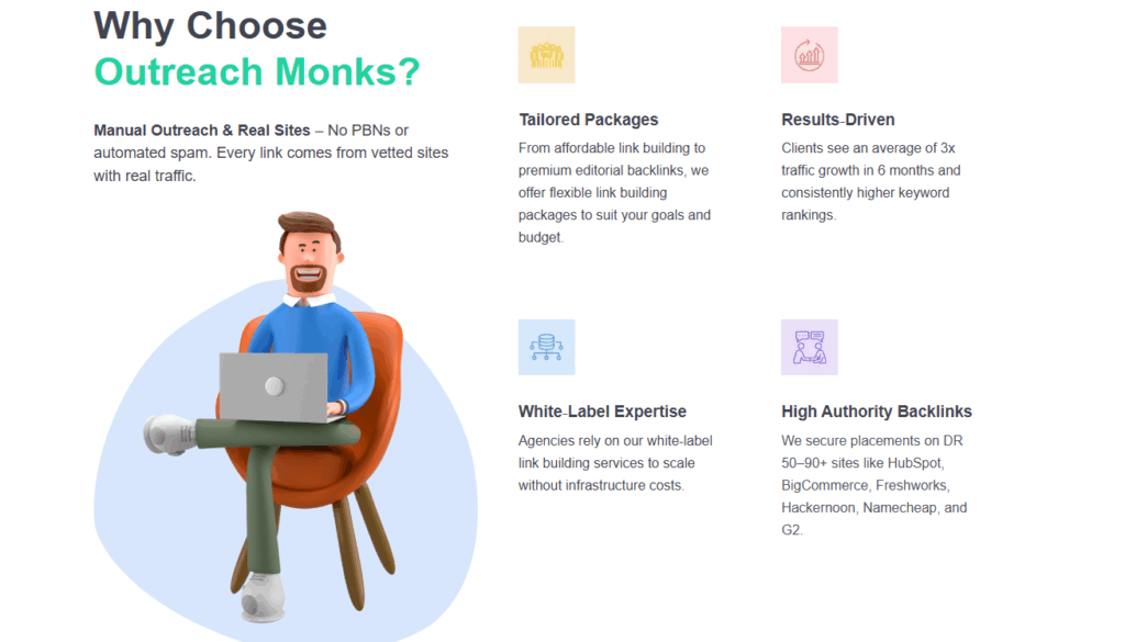 The agency was built to help brands scale visibility through clean, contextual link placements that improve rankings without risks. Instead of chasing quick wins, Outreach Monks focuses on long-term authority growth backed by content-driven outreach.